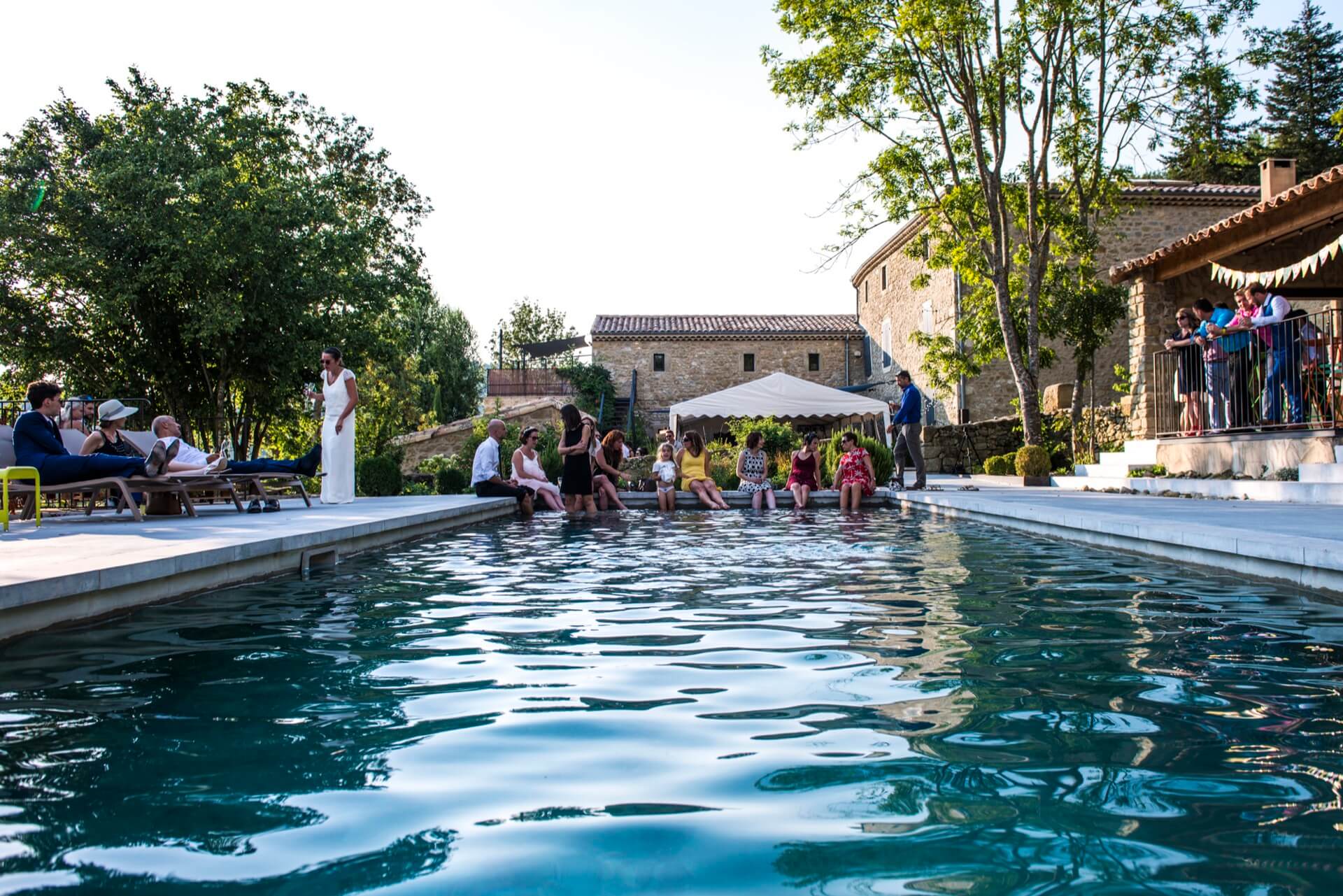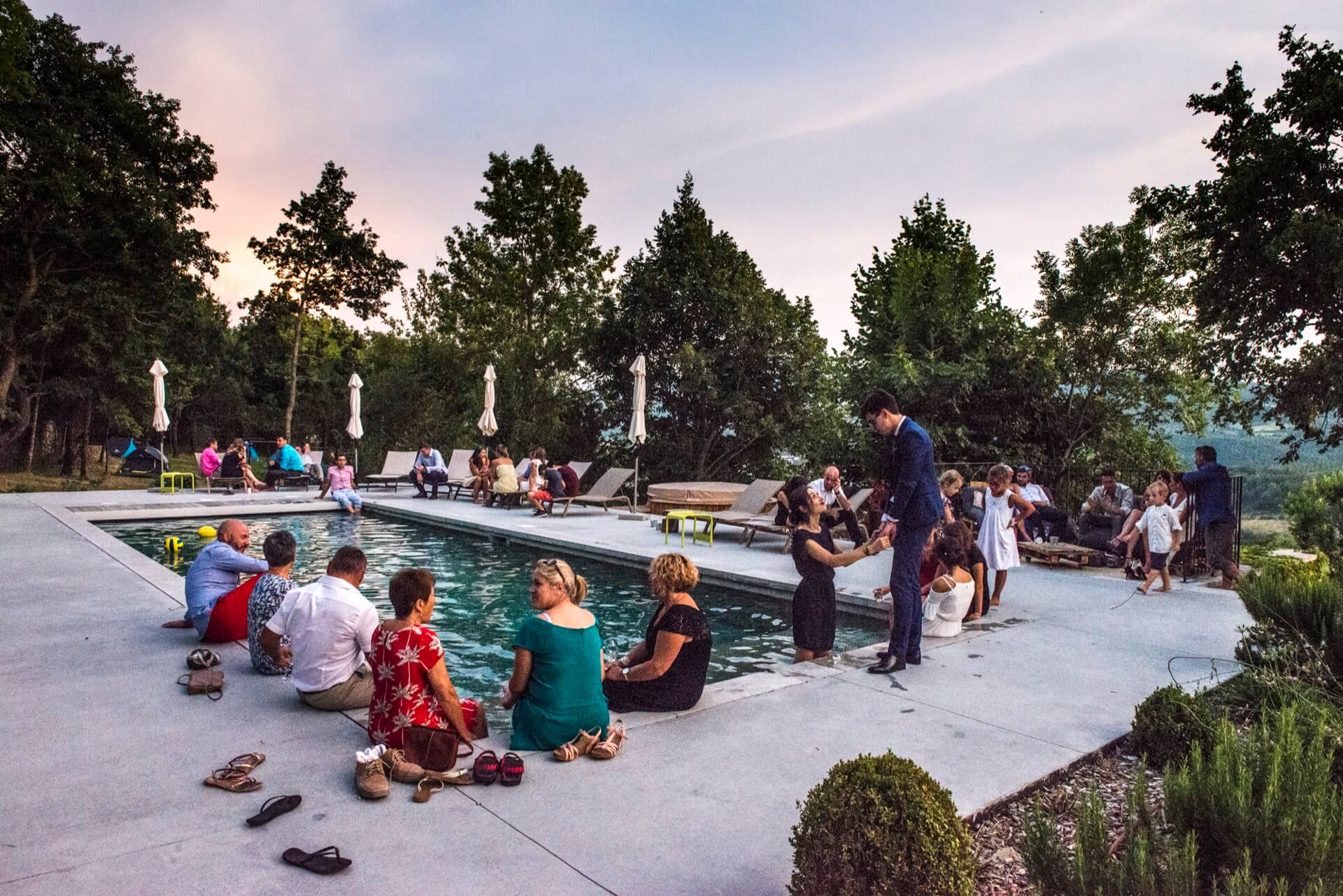 Sur le bord de la piscine, les invités ont défaits leurs chaussures. Les pieds nus dans l’eau, des sourires s’échappent avec le clapotis des remous.